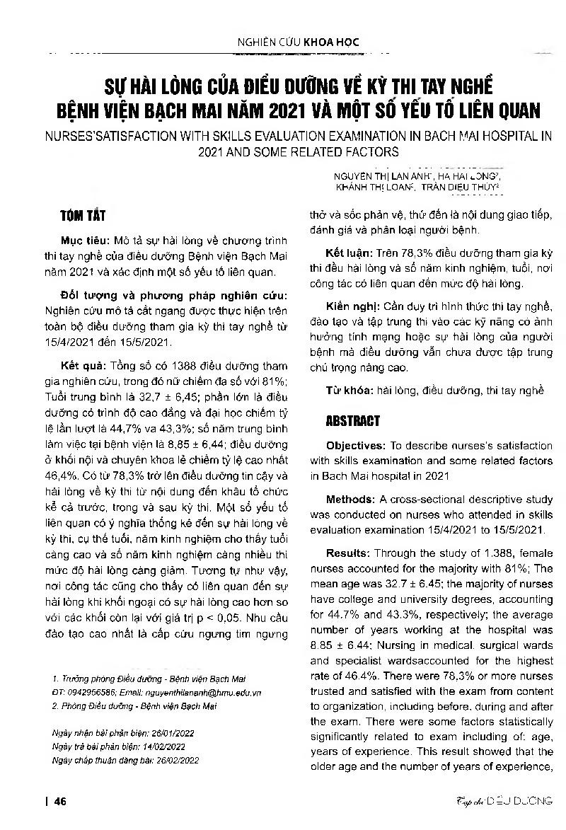 Sự hài lòng của điều dưỡng về kỳ thi tay nghề Bệnh viện Bạch Mai năm 2021 và một số yếu tố liên quan = nurses satisfaction with skills evaluation examination in Bach Mai hospital in 2021 and some related factors