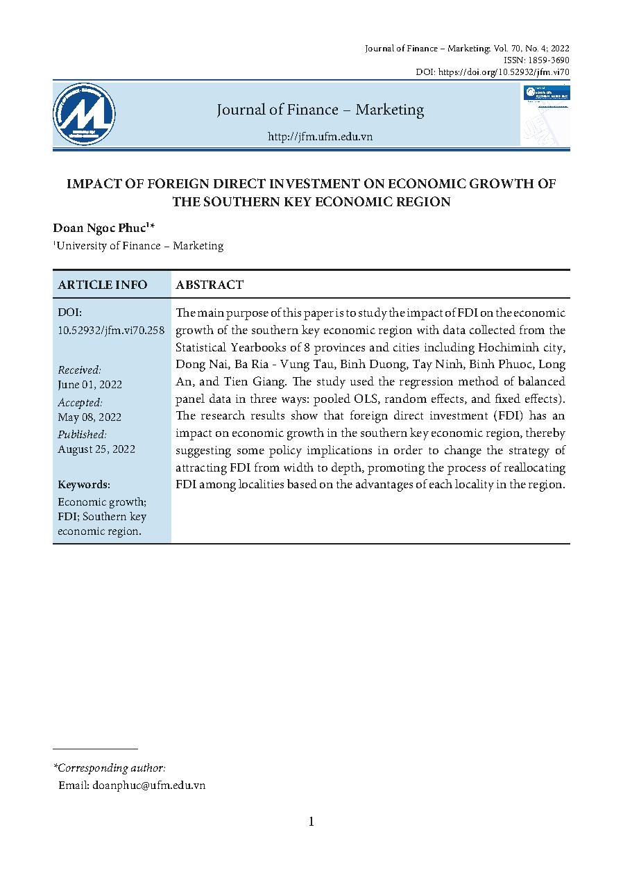 Tác động của đầu tư trực tiếp nước ngoài đến tăng trưởng kinh tế Vùng Kinh tế trọng điểm phía Nam = Impact of foreign direct investment on economic growth of the Southern key economic region