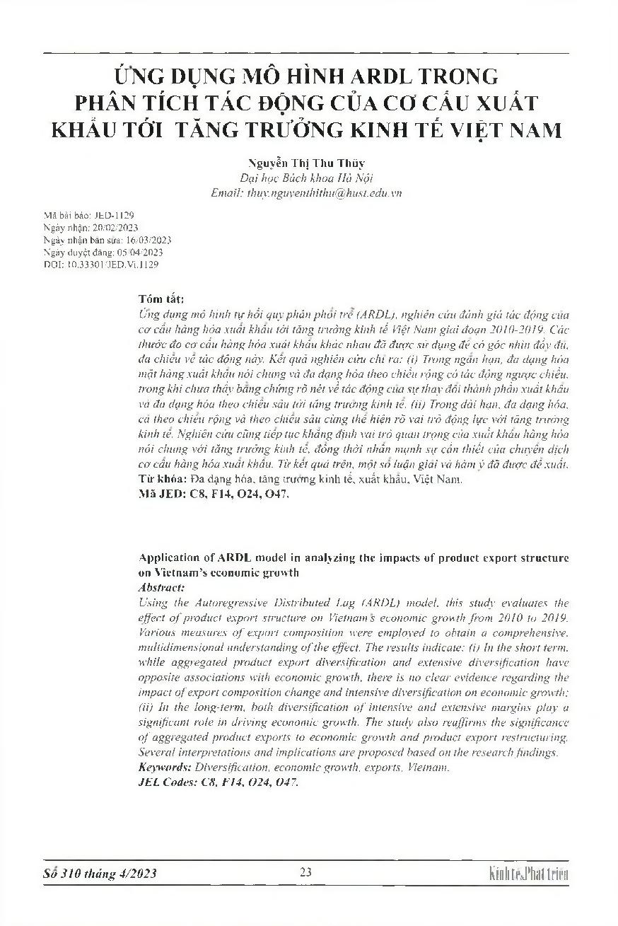 Ứng dụng mô hình ARDL trong phân tích tác động của cơ cấu xuất khẩu tới tăng trưởng kinh tế Việt Nam = Application of ARDL model in analyzing the impacts of product export structure on Vietnam's economic growth