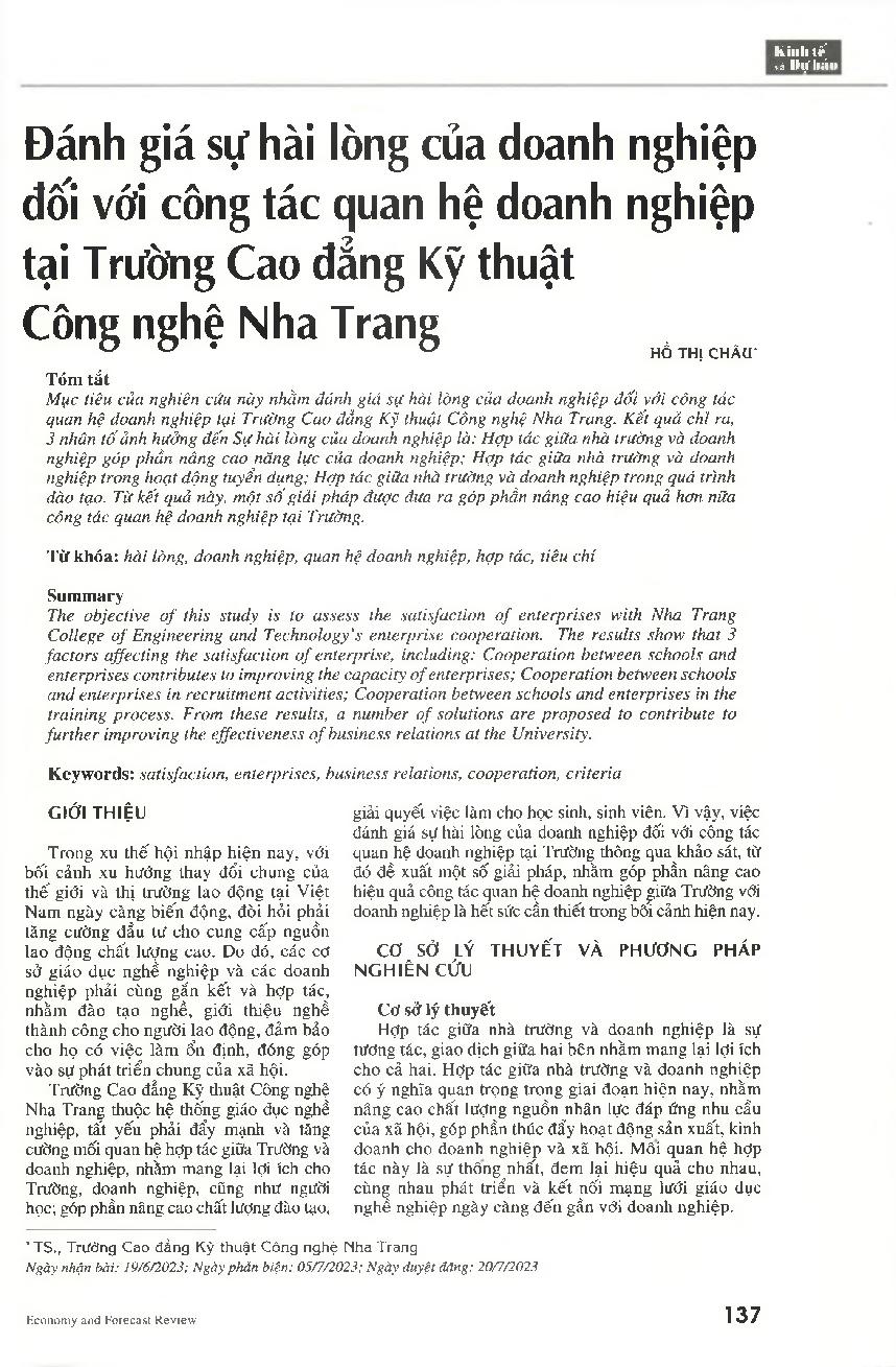 Đánh giá sự hài lòng của doanh nghiệp đối với công tác quan hệ doanh nghiệp tại Trường Cao đẳng Kỹ thuật Công nghệ Nha Trang
