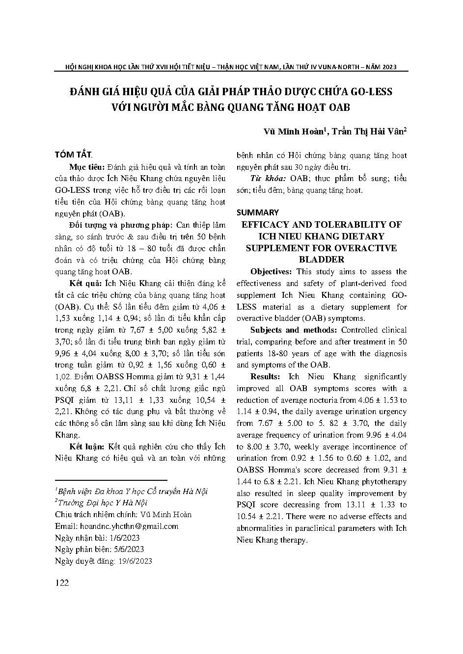 Đánh giá hiệu quả của giải pháp thảo dược chứa GO-LESS với người mắc bàng quang tăng hoạt OAB