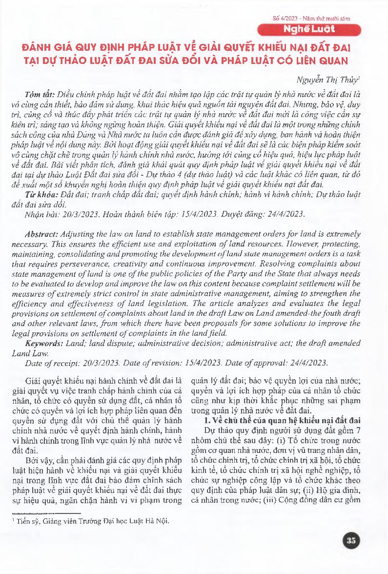 Đánh giá quy định pháp luật về giải quyết khiếu nại đất đai tại dự thảo Luật Đất đai sửa đổi và pháp luật có liên quan = Assessing legal regulations on solving complaints over the land in the draft of the law amended on land and relevant laws
