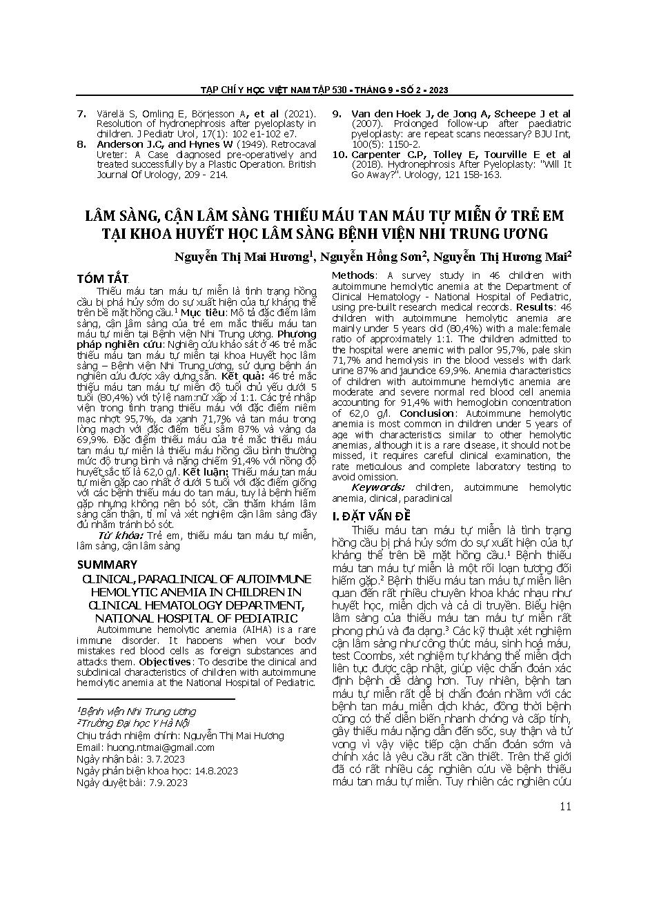 Lâm sàng, cận lâm sàng thiếu máu tan máu tự miễn ở trẻ em tại khoa huyết học lâm sàng bệnh viện nhi trung ương = Clinical, paraclinical of autoimmune hemolytic anemia in children in clinical hematology department, national hospital of pediatric