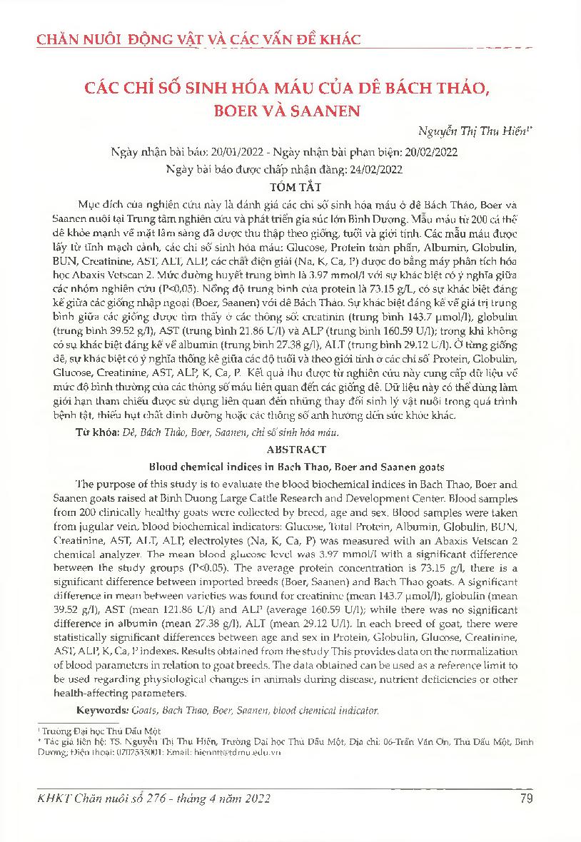 Các chỉ số sinh hóa máu của dê Bách Thảo, Boer và Saanen = Blood chemical indices in Bach Thao, Boer and Saanen goats