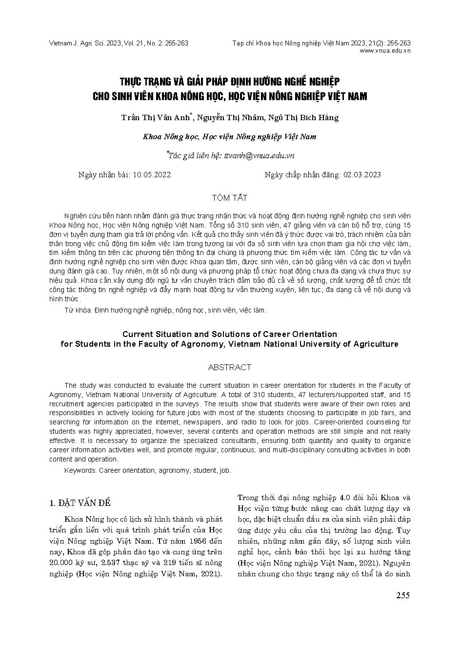 Thực trạng và giải pháp định hướng nghề nghiệp cho sinh viên Khoa Nông học, Học viện Nông nghiệp Việt Nam