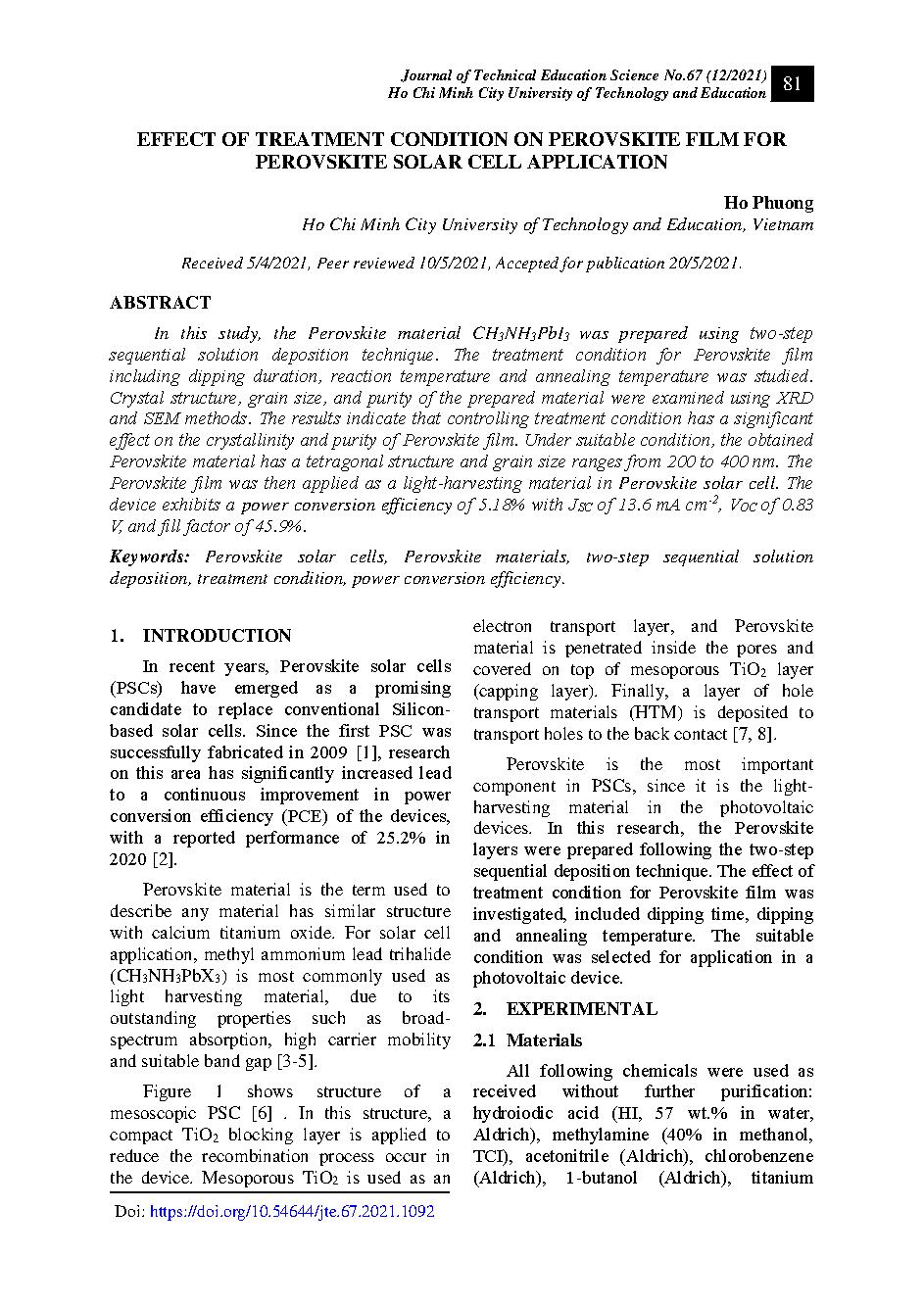 Ảnh hưởng của điều kiện xử lý trên phim perovskite cho ứng dụng pin mặt trời perovskite