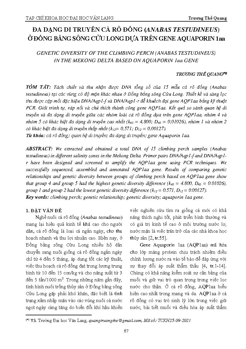 Đa dạng di truyền cá rô đồng (anabas testudineus) ở Đồng bằng sông Cửu Long dựa trên gene aquaporin 1aa = Genetic diversity of the climbing perch (anabas testudineus) in the Mekong Delta based on aquaporin 1aa gene