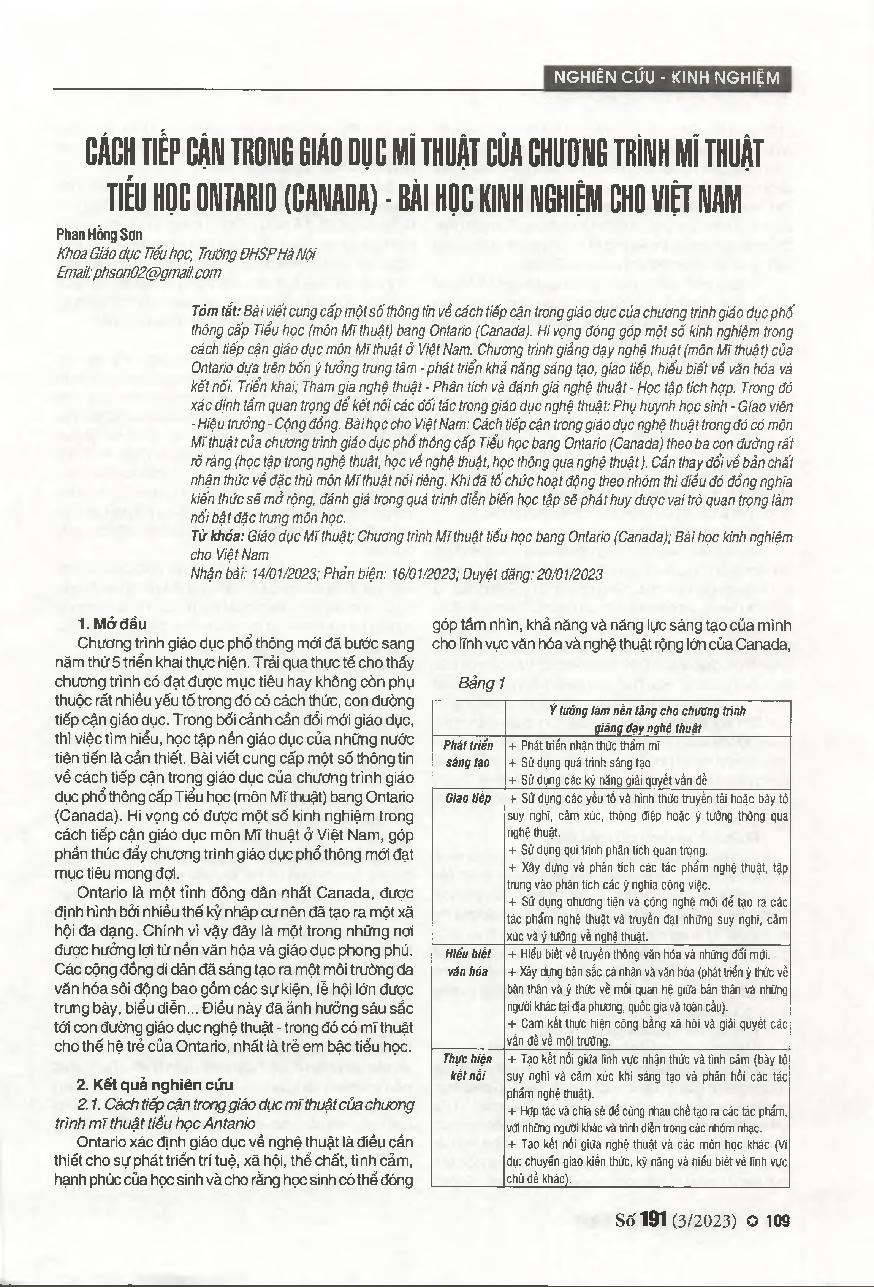 Cách tiếp cận trong giáo dục mĩ thuật của chương trình Mĩ thuật tiểu học Ontario (Canada) - Bài học kinh nghiệm cho Việt Nam = The approach to Art education of Ontario's art curriculum (Canada) - Implications for Vietnam