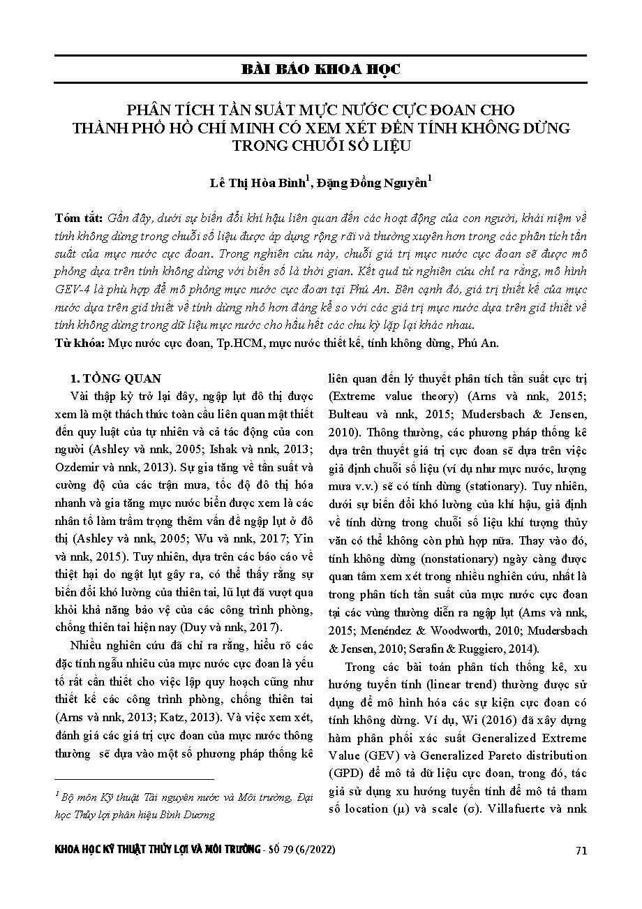Phân tích tần suất mực nước cực đoan cho thành phố Hồ Chí Minh có xem xét đến tính không dừng trong chuỗi số liệu = Nonstationary extreme value analysis for estimation of design water level of phuan station, Ho Chi Minh city