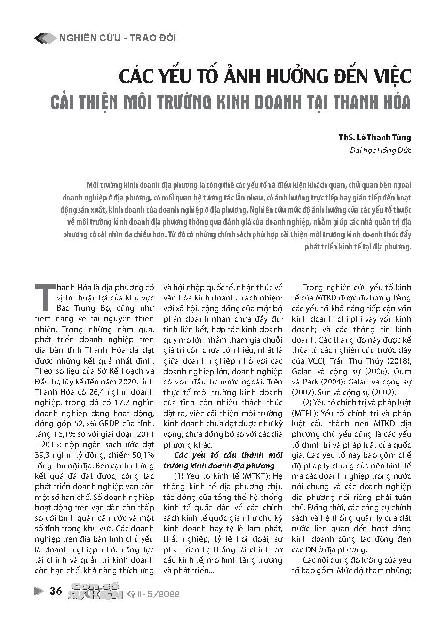 Các yếu tố ảnh hưởng đến việc cải thiện môi trường kinh doanh tại Thanh Hóa = Factors affecting the improvement of business environment in Thanh Hoa