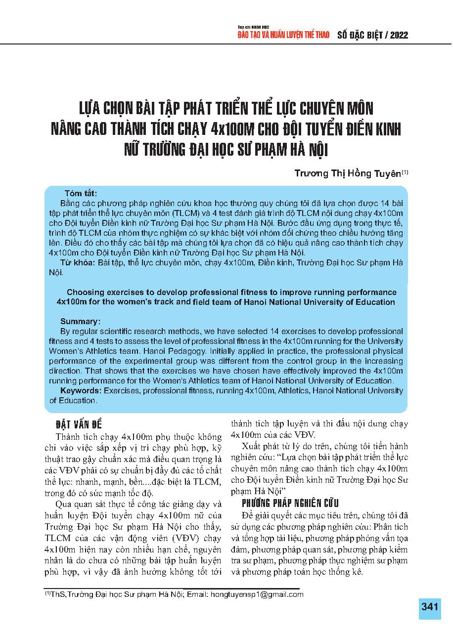 Lựa chọn bài tập phát triển thể lực chuyên môn nâng cao thành tích chạy 4x100m cho đội tuyển Điền kinh nữ Trường Đại học Sư phạm Hà Nội = Choosing exercises to develop professional fitness to improve running performance 4x100m for the women&; 39;s track an