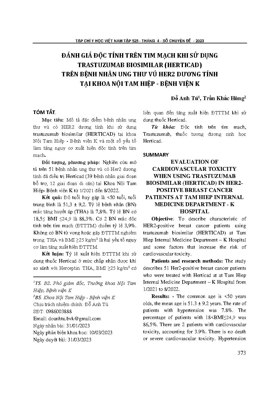 Đánh giá độc tính trên tim mạch khi sử dụng trastuzumab biosimilar (herticad) trên bệnh nhân ung thư vú HER2 dương tính tại khoa nội tam hiệp - Bệnh viện K