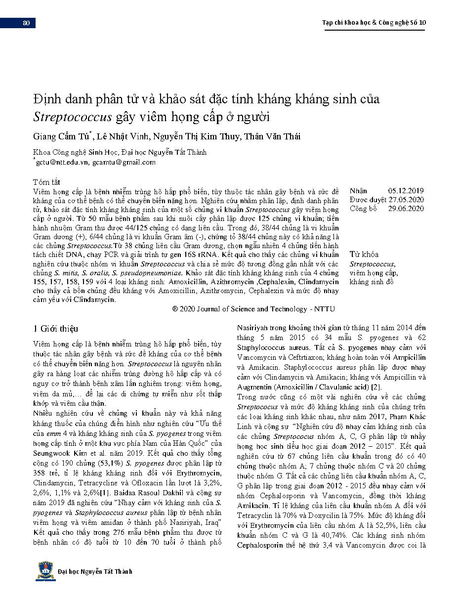 Định danh phân tử và khảo sát đặc tính kháng kháng sinh của Streptococcus gây viêm họng cấp ở người = Molecular identification and survey of antibiotic resistance properties of streptococcus bacteria causing acute pharyngitis in humans