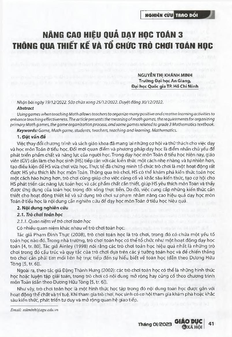 Nâng cao hiệu quả dạy học Toán 3 thông qua thiết kế và tổ chức trò chơi toán học = Improving the effectiveness of teaching grade 3 Mathematics by designing and organizing math games