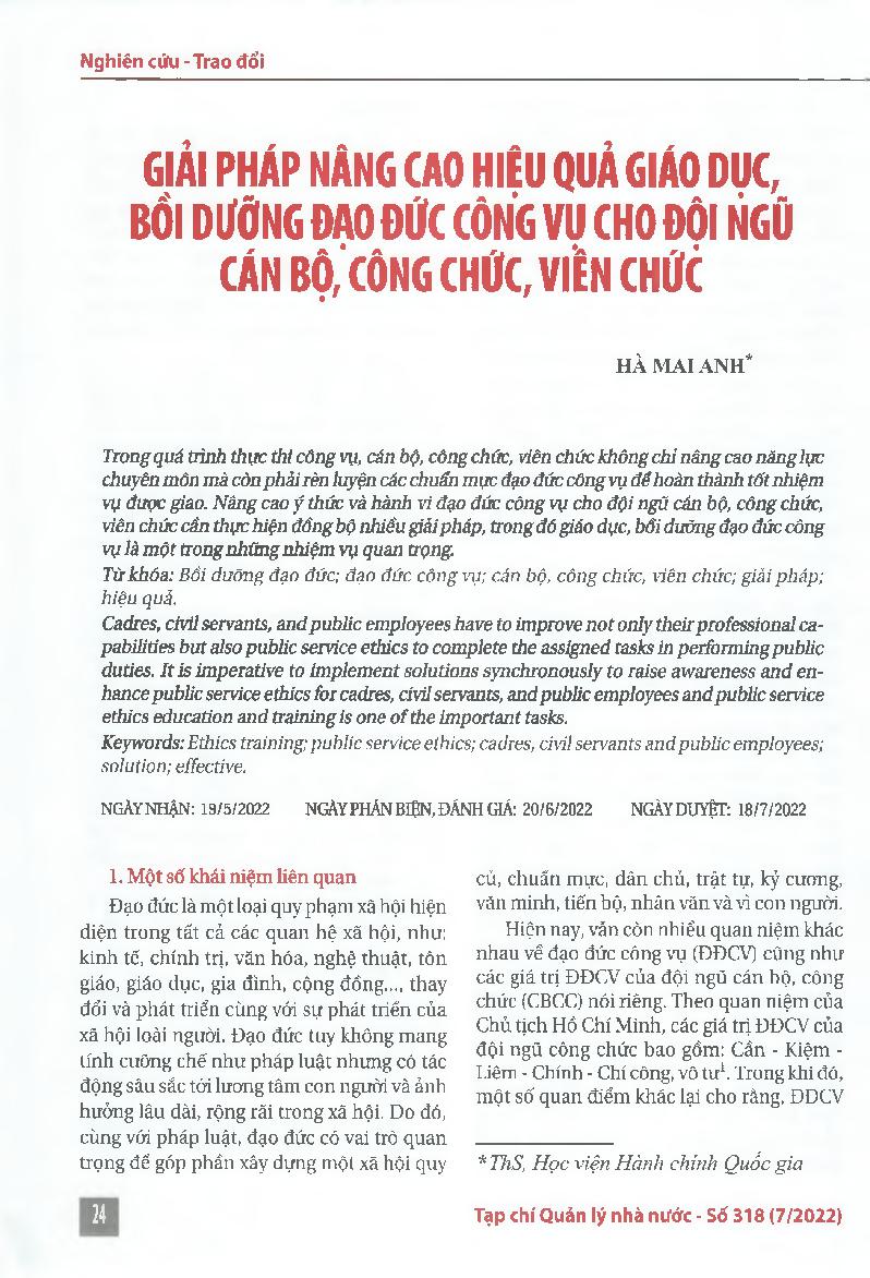 Giải pháp nâng cao hiệu quả giáo dục, bồi dưỡng đạo đức công vụ cho đội ngũ cán bộ, công chức, viên chức = Solutions to increase the quality of public service ethics education and training for cadres, civil servants, and public employees
