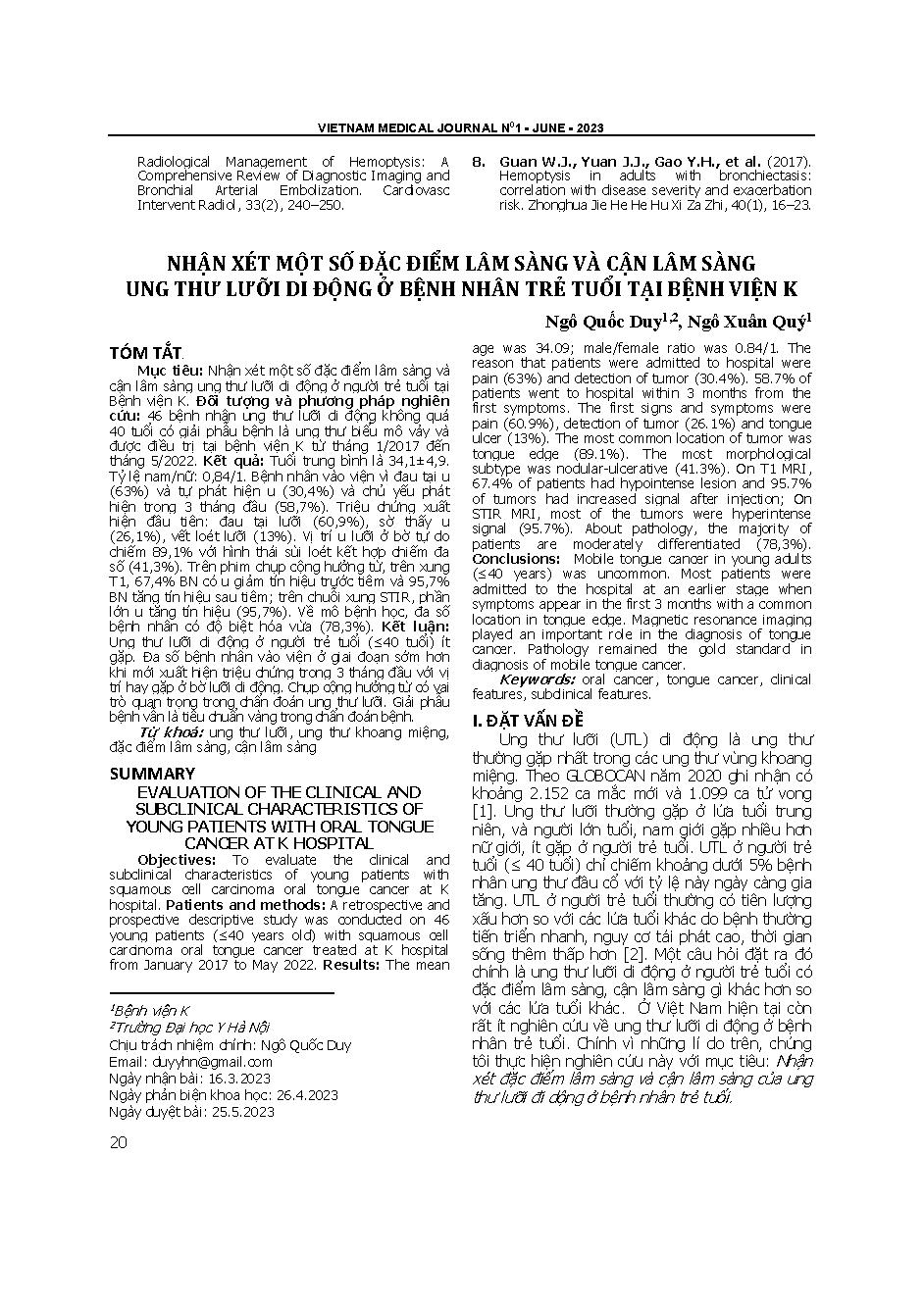 Nhận xét một số đặc điểm lâm sàng và cận lâm sàng ung thư lưỡi di động ở bệnh nhân trẻ tuổi tại Bệnh viện K = Evaluation of the clinical and subclinical characteristics of young patients with oral tongue cancer at K hospital
