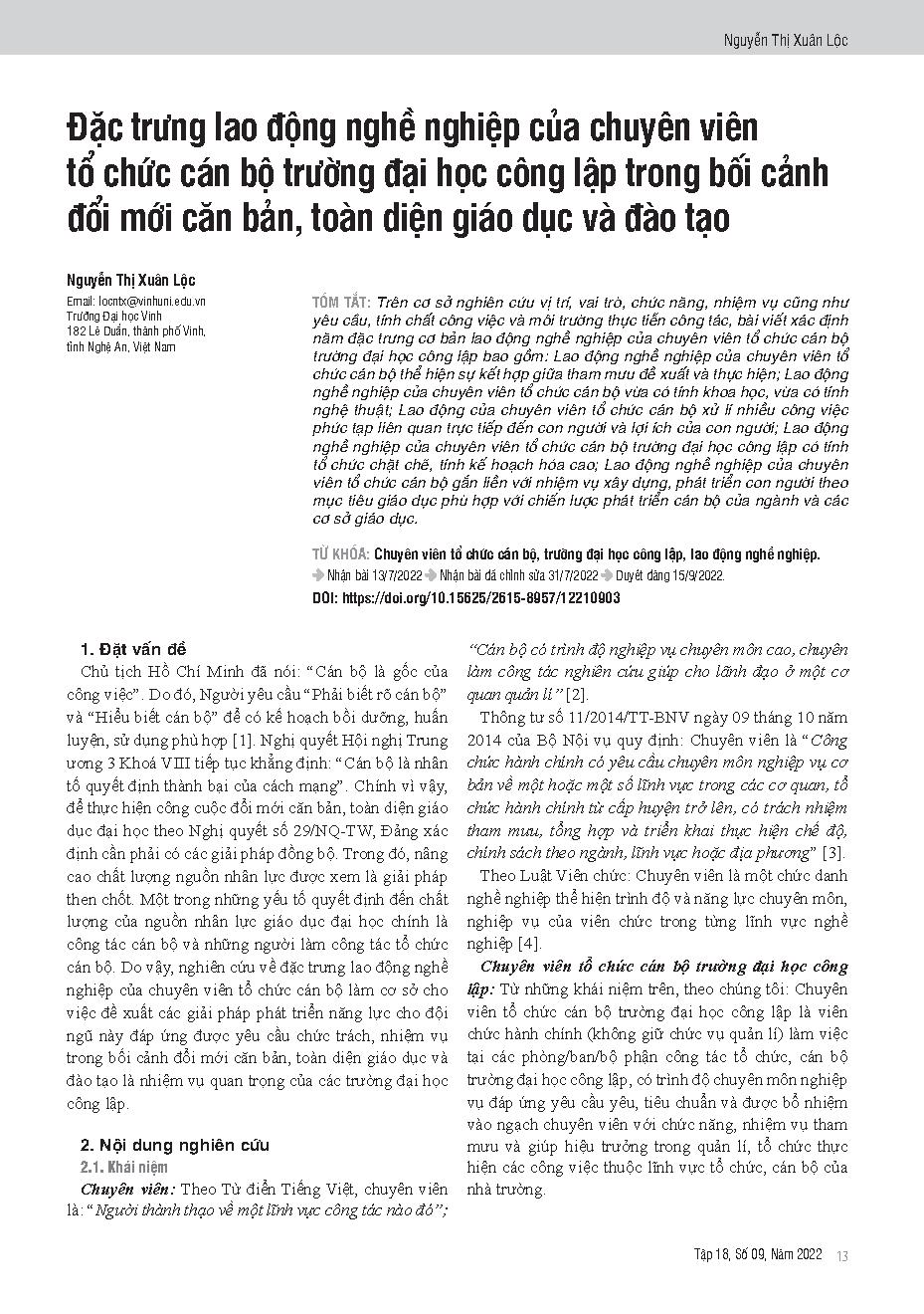 Đặc trưng lao động nghề nghiệp của chuyên viên tổ chức cán bộ trường đại học công lập trong bối cảnh đổi mới căn bản, toàn diện giáo dục và đào tạo = Occupational characteristics of staff in the personnel and organization departments of public universitie