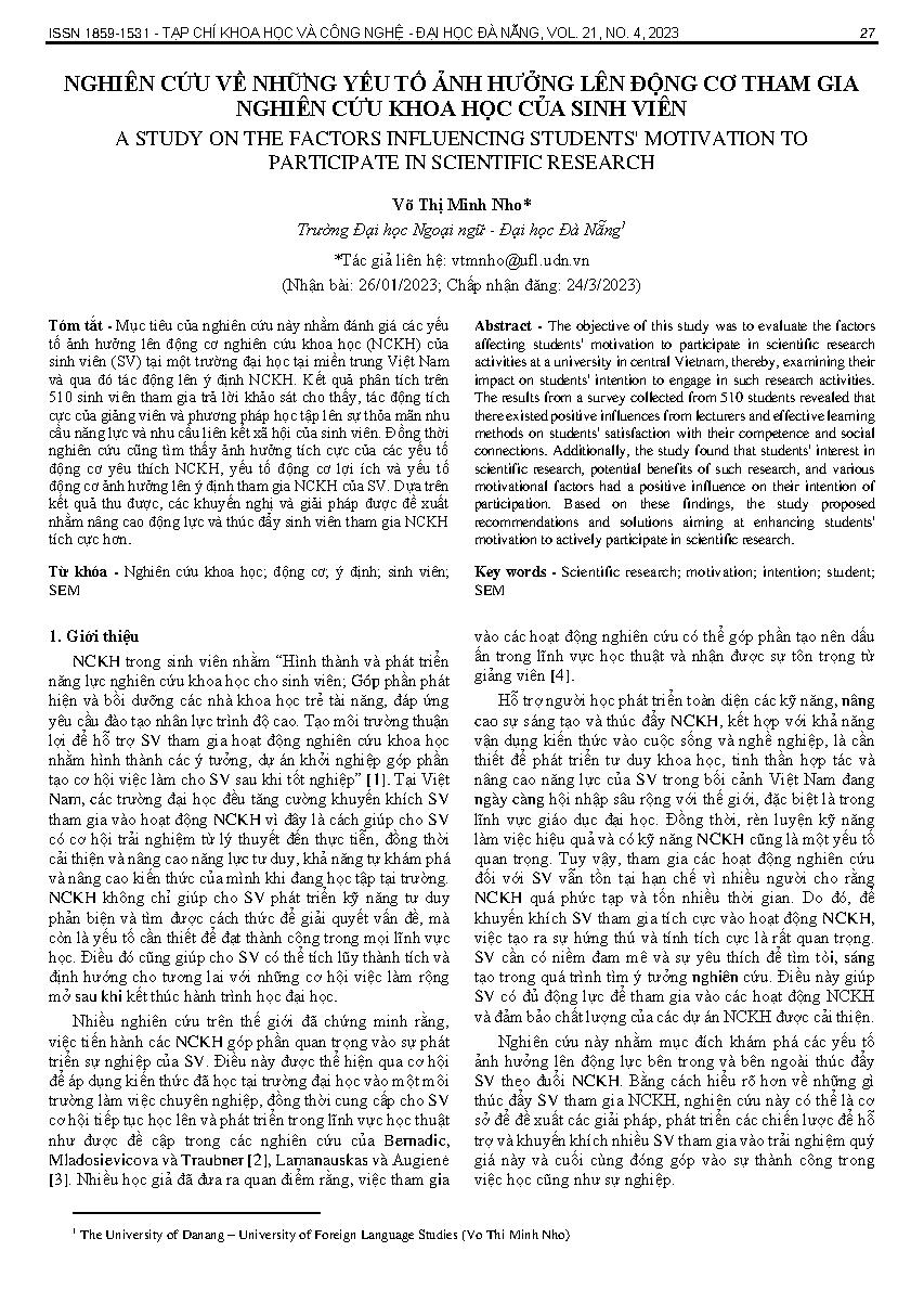 Nghiên cứu về những yếu tố ảnh hưởng lên động cơ tham gia nghiên cứu khoa học của sinh viên = A study on the factors influencing students' motivation to participate in scientific research