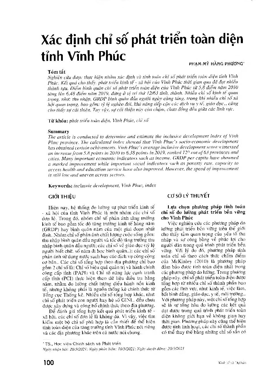 Xác định chỉ số phát triển toàn diện tỉnh Vĩnh Phúc