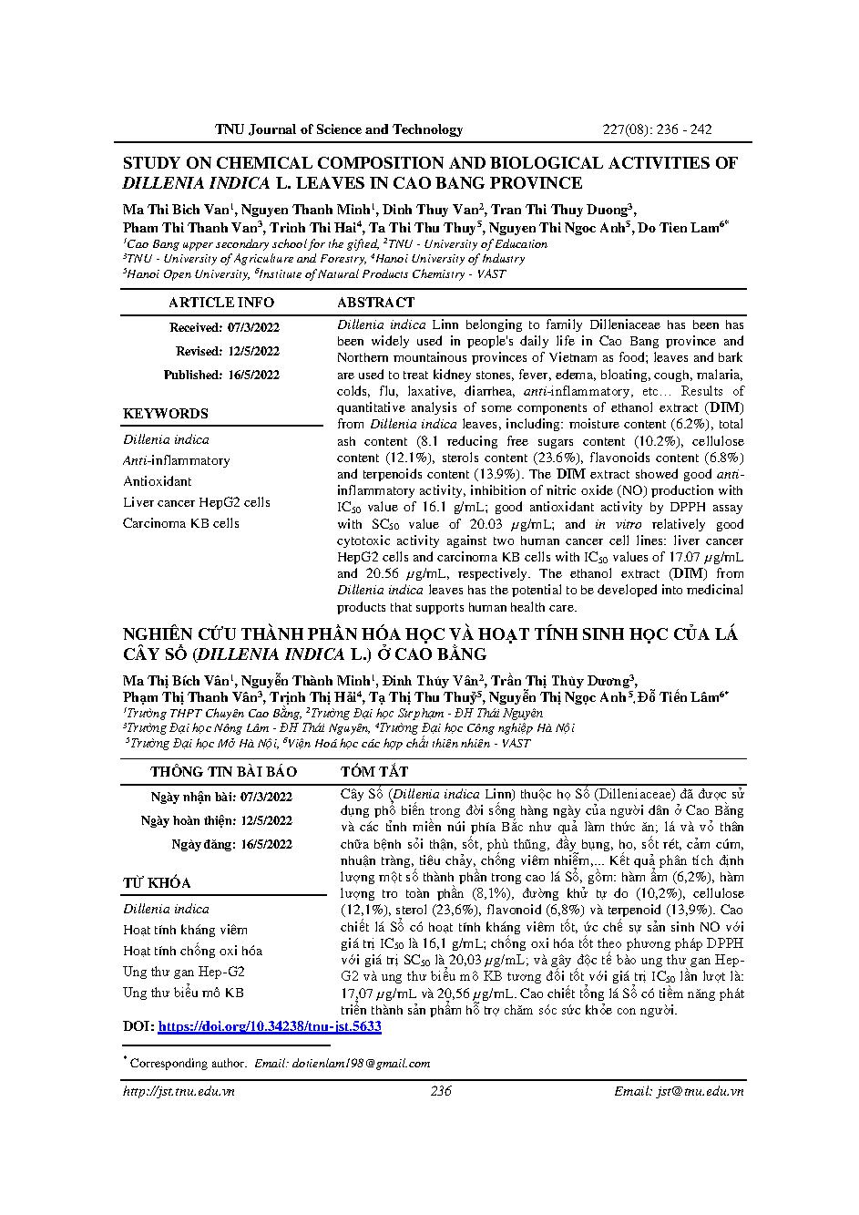 Nghiên cứu thành phần hóa học và hoạt tính sinh học của lá cây sổ (dillenia indica l.) ở Cao Bằng = Study on chemical composition and biological activities of dillenia indica l. leaves in Cao Bang province