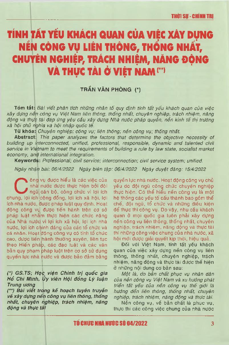 Tính tất yếu khách quan của việc xây dựng nền công vụ liên thông, thống nhất, chuyên nghiệp, trách nhiệm, năng động và thực tài ở Việt Nam = The objective necessity of building up interconnected, unified, professional, responsible, dynamic and talented ci