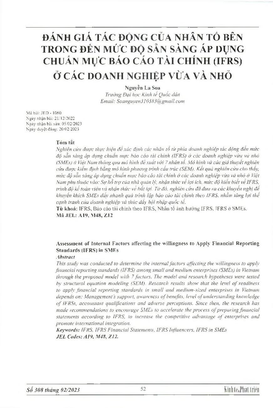 Đánh giá tác động của nhân tố bên trong đến mức độ sẵn sàng áp dụng chuẩn mực báo cáo tài chính (IFRS) ở các doanh nghiệp vừa và nhỏ = Assessment of Internal Factors affecting the willingness to Apply Financial Reporting Standards (IFRS) in SMEs