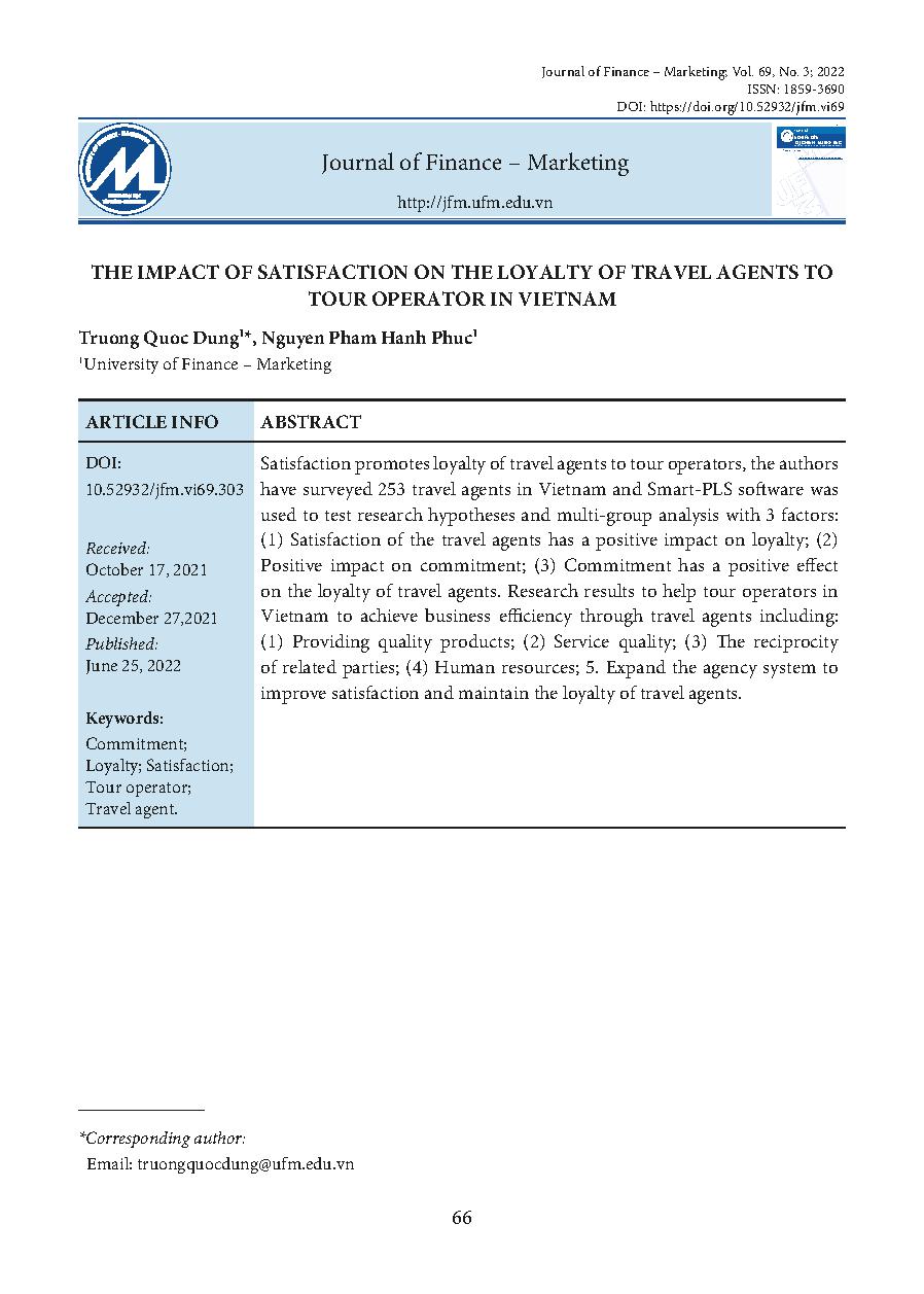 Tác động của sự hài lòng đến lòng trung thành của doanh nghiệp lữ hành gởi khách đối với doanh nghiệp lữ hành nhận khách tại Việt Nam = The impact of satisfaction on the loyalty of travel agents to tour operator in Vietnam