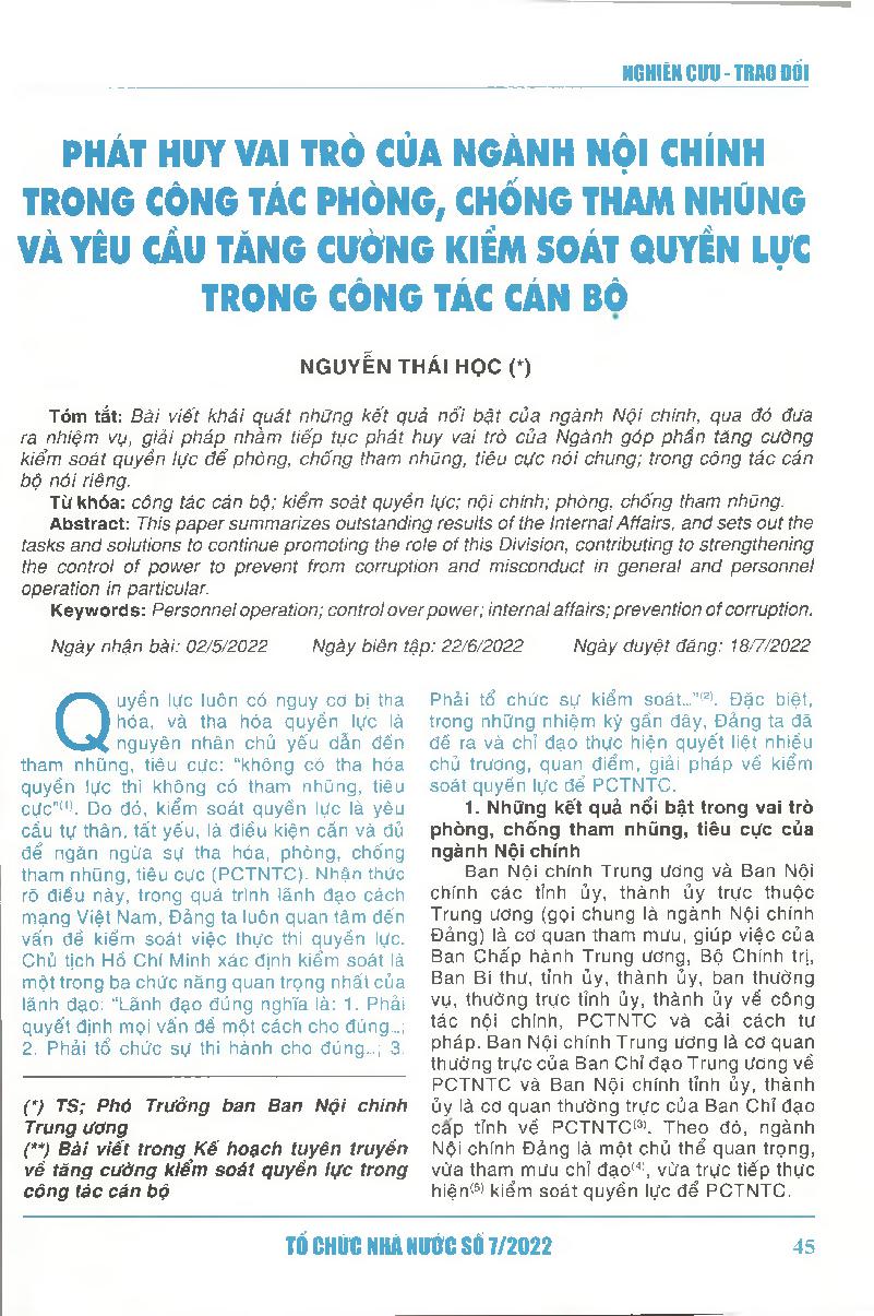 Phát huy vai trò của ngành nội chính trong công tác phòng, chống tham nhũng và yêu cầu tăng cường kiểm soát quyền lực trong công tác cán bộ = Promoting the role of Internal Affairs sector in corruption prevention and control and requirements on enhanced c