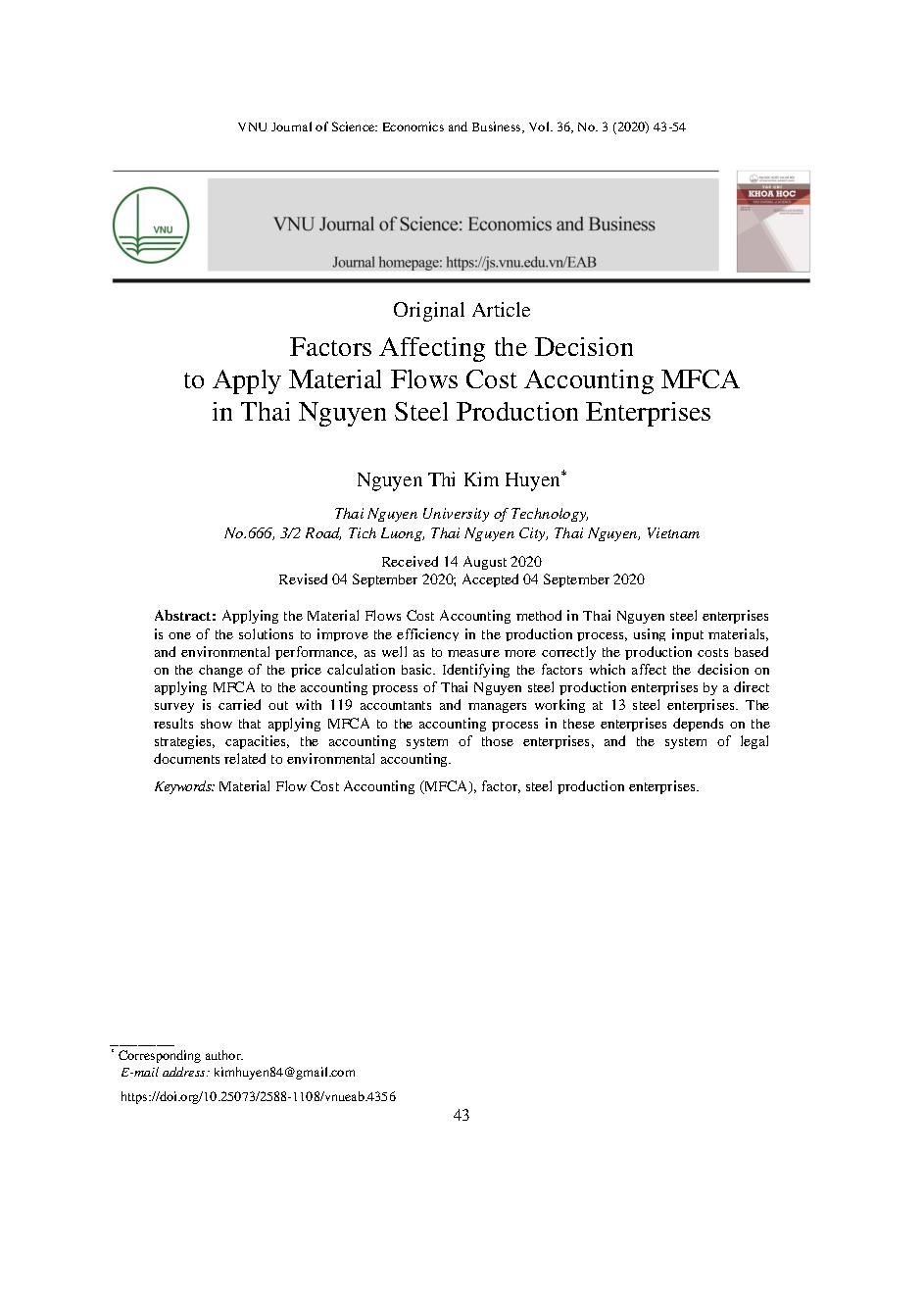 Các yếu tố ảnh hưởng đến quyết định áp dụng kế toán chi phí dòng nguyên vật liệu trong các doanh nghiệp sản xuất thép tại Thái Nguyên = Factors affecting the decision to apply material flows cost accounting MFCA in Thai Nguyen steel production enterprises