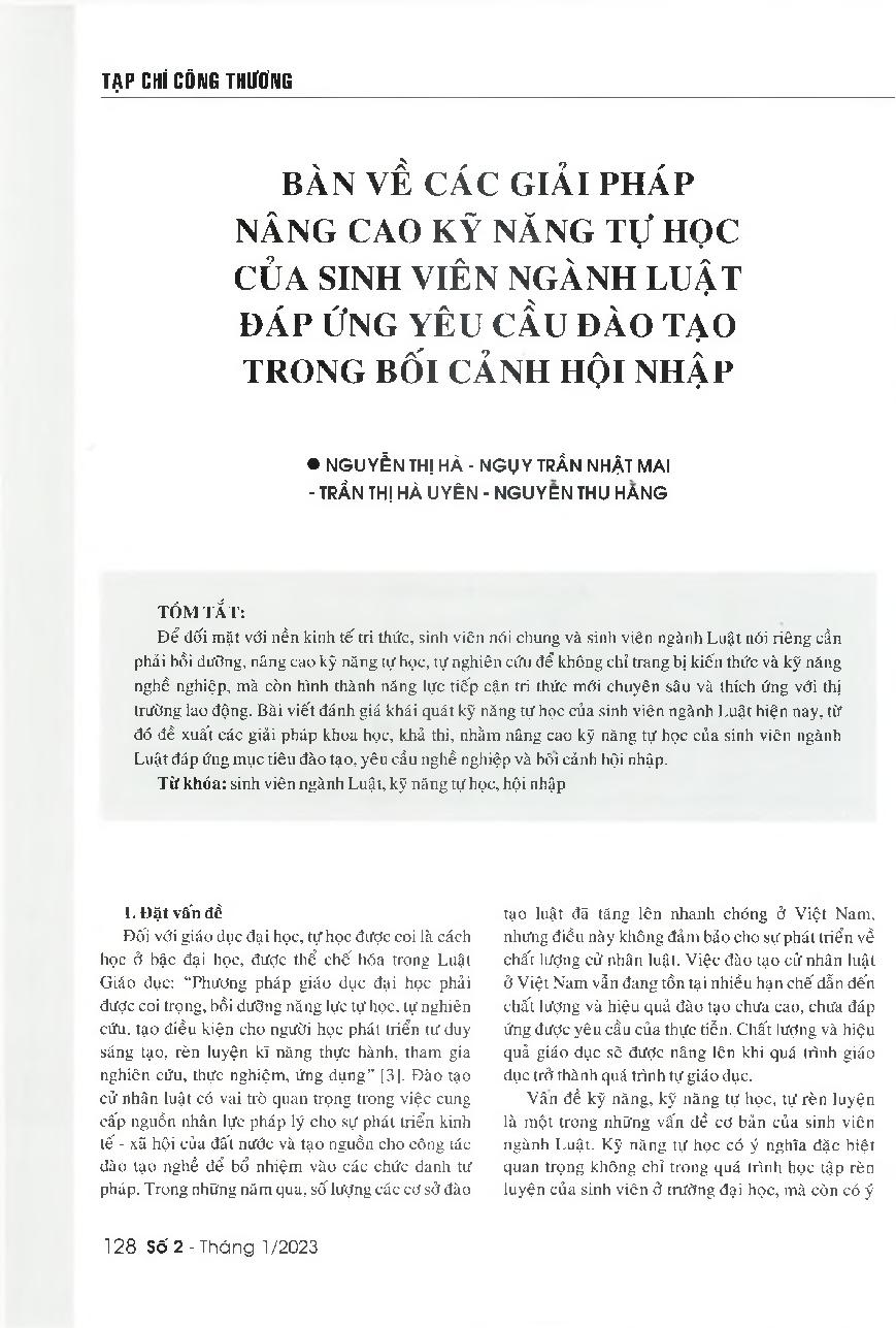 Bàn về các giải pháp nâng cao kĩ năng tự học của sinh viên ngành Luật đáp ứng yêu cầu đào tạo trong bối cảnh hội nhập = Solutions to improve the self-study skill of law students to meet training requirements in the context of Vietnam's integration process
