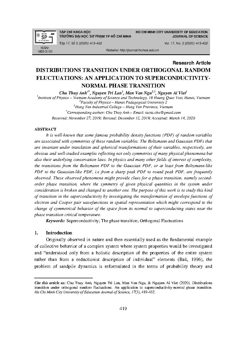 DỊCH CHUYỂN PHÂN BỐ DƯỚI TÁC ĐỘNG CỦA CÁC THĂNG GIÁNG NGẪU NHIÊN VUÔNG GÓC: ỨNG DỤNG CHO CHUYỂN PHA SIÊU DẪN - KIM LỌAI = DISTRIBUTIONS TRANSITION UNDER ORTHOGONAL RANDOM FLUCTUATIONS: AN APPLICATION TO SUPERCONDUCTIVITY-NORMAL PHASE TRANSITION