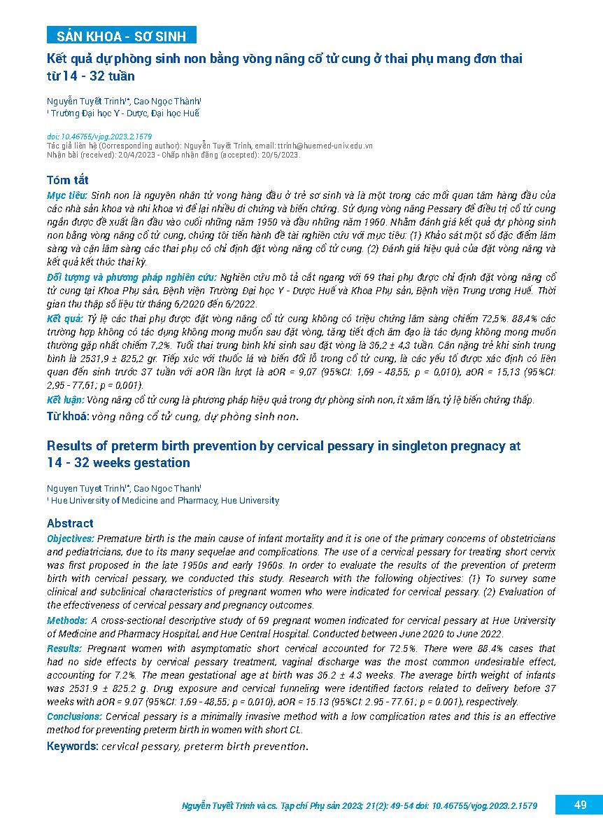 Kết quả dự phòng sinh non bằng vòng nâng cổ tử cung ở thai phụ mang đơn thai từ 14 - 32 tuần = Results of preterm birth prevention by cervical pessary in singleton pregnacy at 14 - 32 weeks gestation