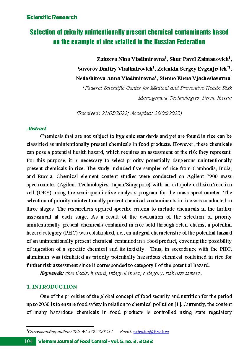 Lựa chọn mức độ ưu tiên sự tồn tại của hóa chất ô nhiễm ngẫu nhiên có mặt trong các mẫu gạo bán lẻ ở Liên bang Nga = Selection of priority unintentionally present chemical contaminants based on the example of rice retailed in the Russian Federation
