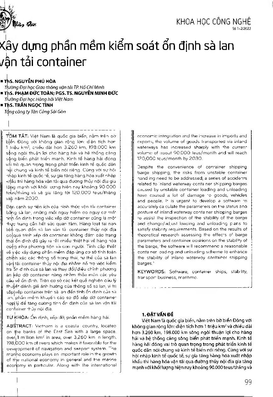 Xây dựng phần mềm kiểm soát ổn định sà lan vận tải container = Developing software to monitor the stability of inland waterway container barges