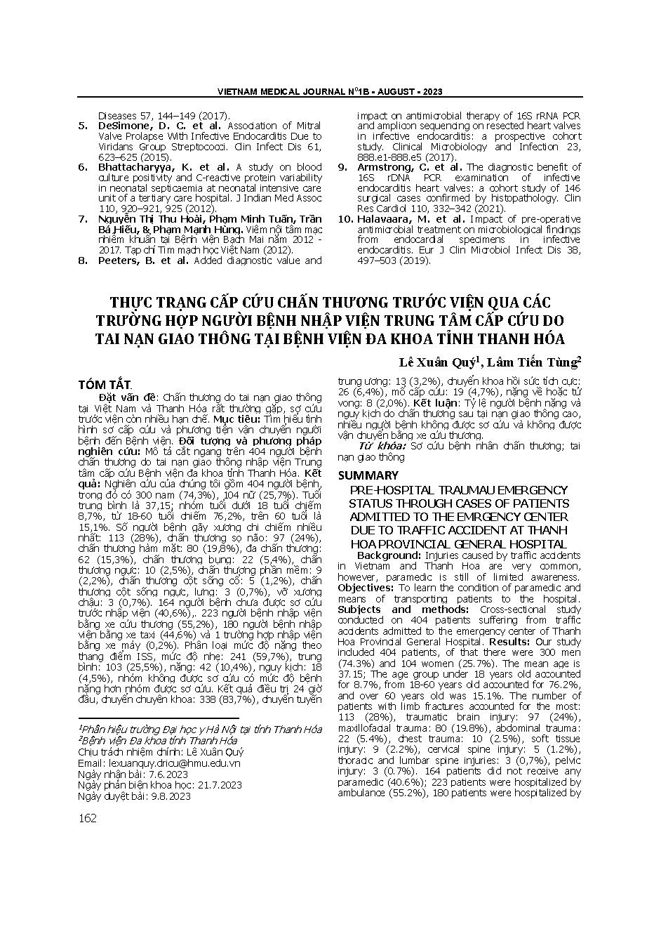Thực trạng cấp cứu chấn thương trước viện qua các trường hợp người bệnh nhập viện trung tâm cấp cứu do tai nạn giao thông tại Bệnh viện Đa khoa tỉnh Thanh Hóa