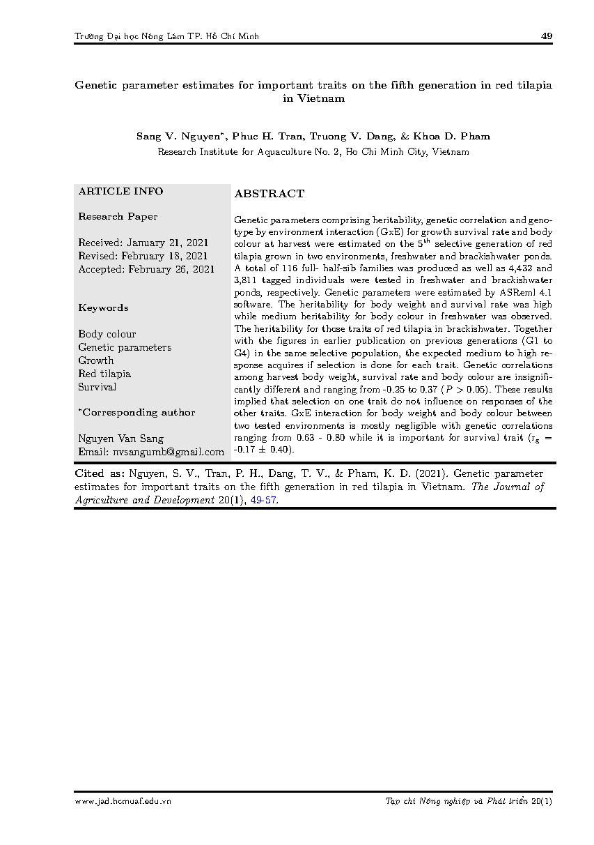Ước tính các thông số di truyền một số tính trạng quan trọng trên quần thể chọn giống rô phi đỏ thế hệ thứ 5 tại Việt Nam