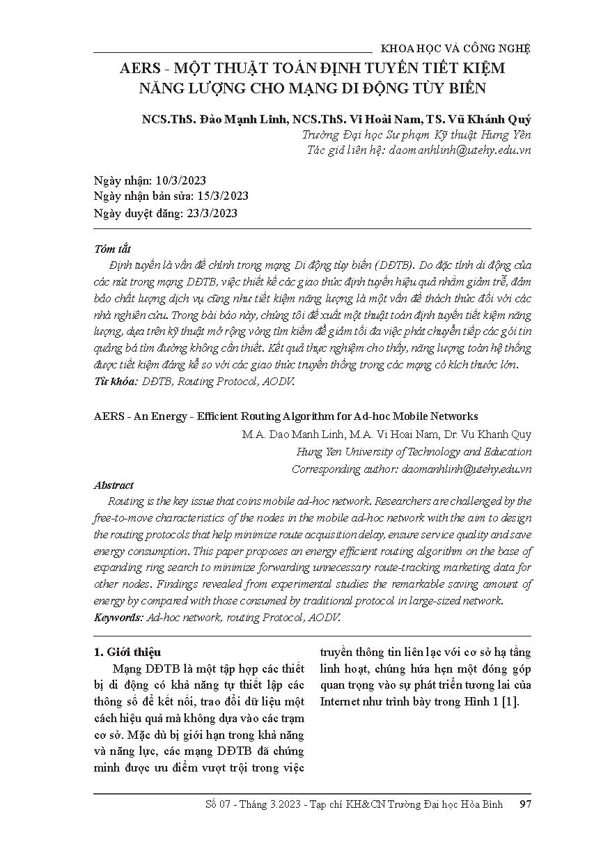 AERS - một thuật toán định tuyến tiết kiệm năng lượng cho mạng di động tùy biến = AERS - An Energy-Efficient Routing algorithm for Ad-hoc mobile networks