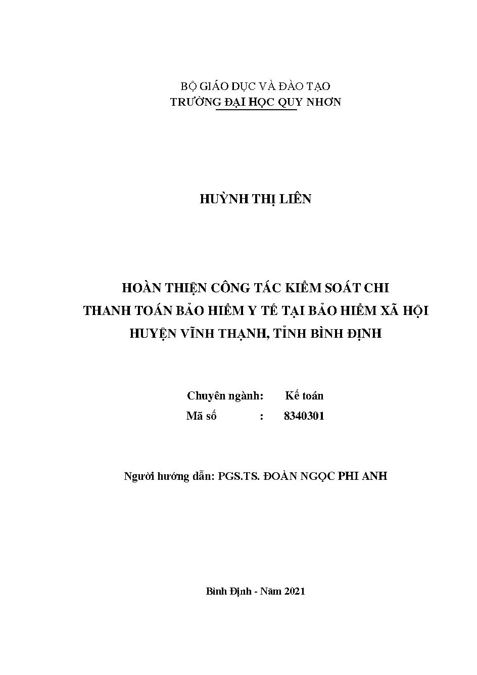 Hoàn thiện công tác kiểm soát chi thanh toán Bảo hiểm y tế tại Bảo hiểm xã hội huyện Vĩnh Thạnh, tỉnh Bình Định