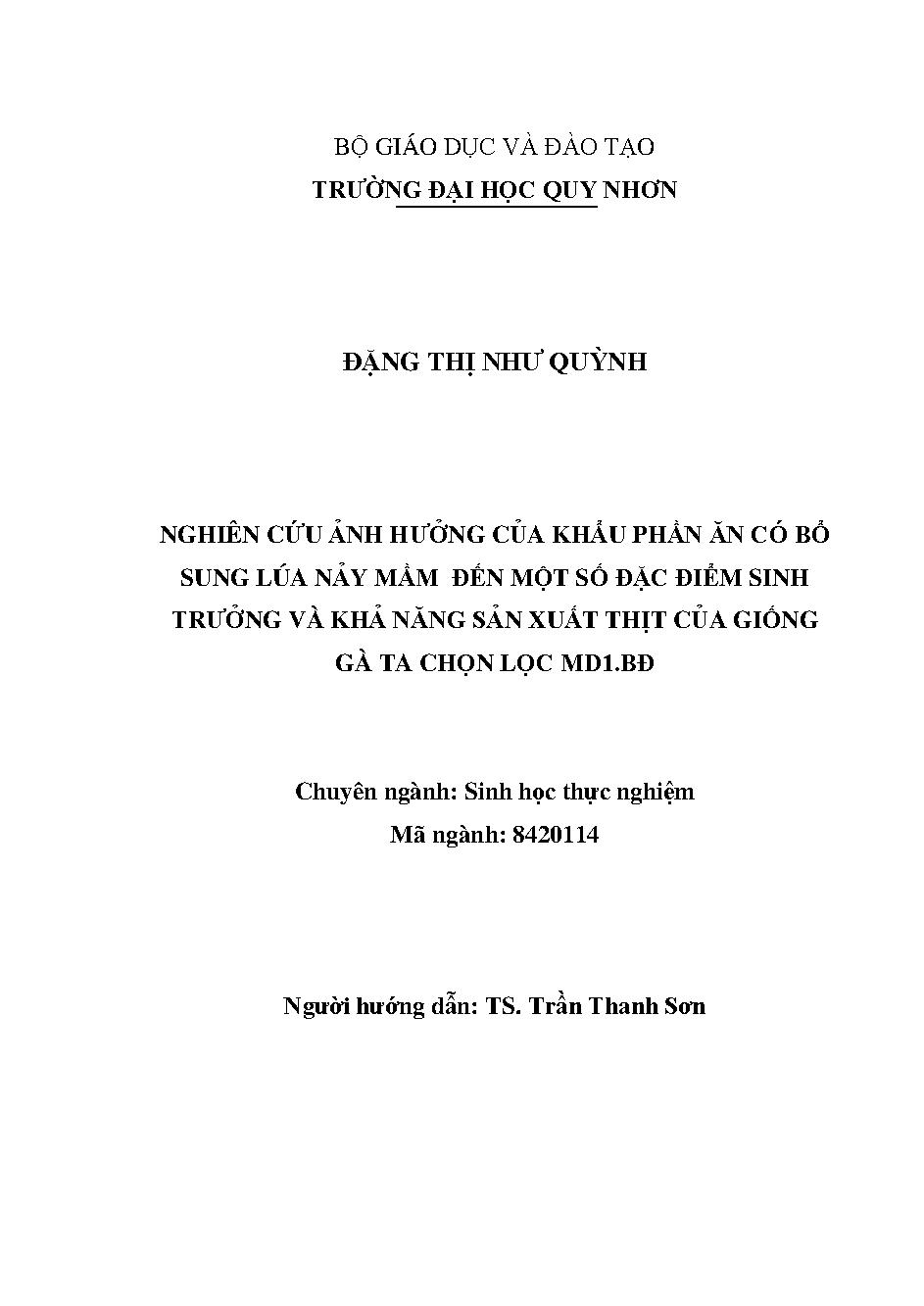 Nghiên cứu ảnh hưởng của khẩu phần ăn có bổ sung lúa nảy mầm đến một số đặc điểm sinh trưởng và khả năng xuất thịt của giống gà ta chọn lọc MD1.BĐ