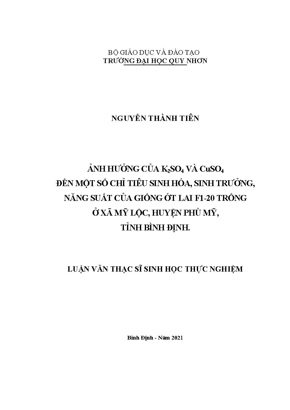 Nghiên cứu ảnh hưởng của K2SO4 và CuSO4 đến một số chỉ tiêu sinh hóa, sinh trưởng, năng suất của giống ớt cay lai F1-20 trồng ở xã Mỹ Lộc, huyện Phù Mỹ, tỉnh Bình Định