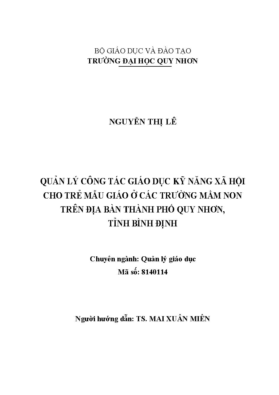 Quản lý công tác giáo dục kỹ năng xã hội cho trẻ mẫu giáo ở các trường mầm non trên địa bàn thành phố Quy Nhơn, tỉnh Bình Định