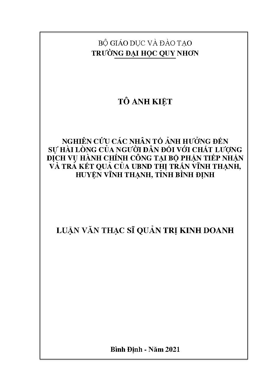 Nghiên cứu các nhân tố ảnh hưởng đến sự hài lòng của người dân đối với chất lượng dịch vụ hành chính công tại Bộ phận tiếp nhận và trả kết quả của Uỷ ban nhân dân thị trấn Vĩnh Thạnh, huyện Vĩnh Thạnh, tỉnh Bình Định