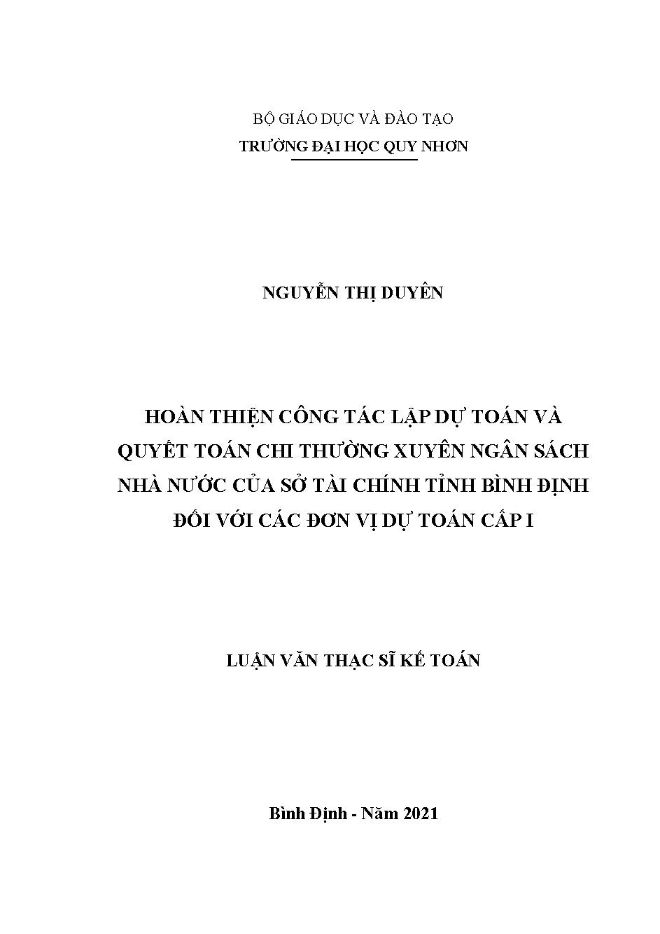 Hoàn thiện công tác lập dự toán và quyết toán chi thường xuyên ngân sách Nhà nước của Sở Tài chính tỉnh Bình Định đối với các đơn vị dự toán cấp I